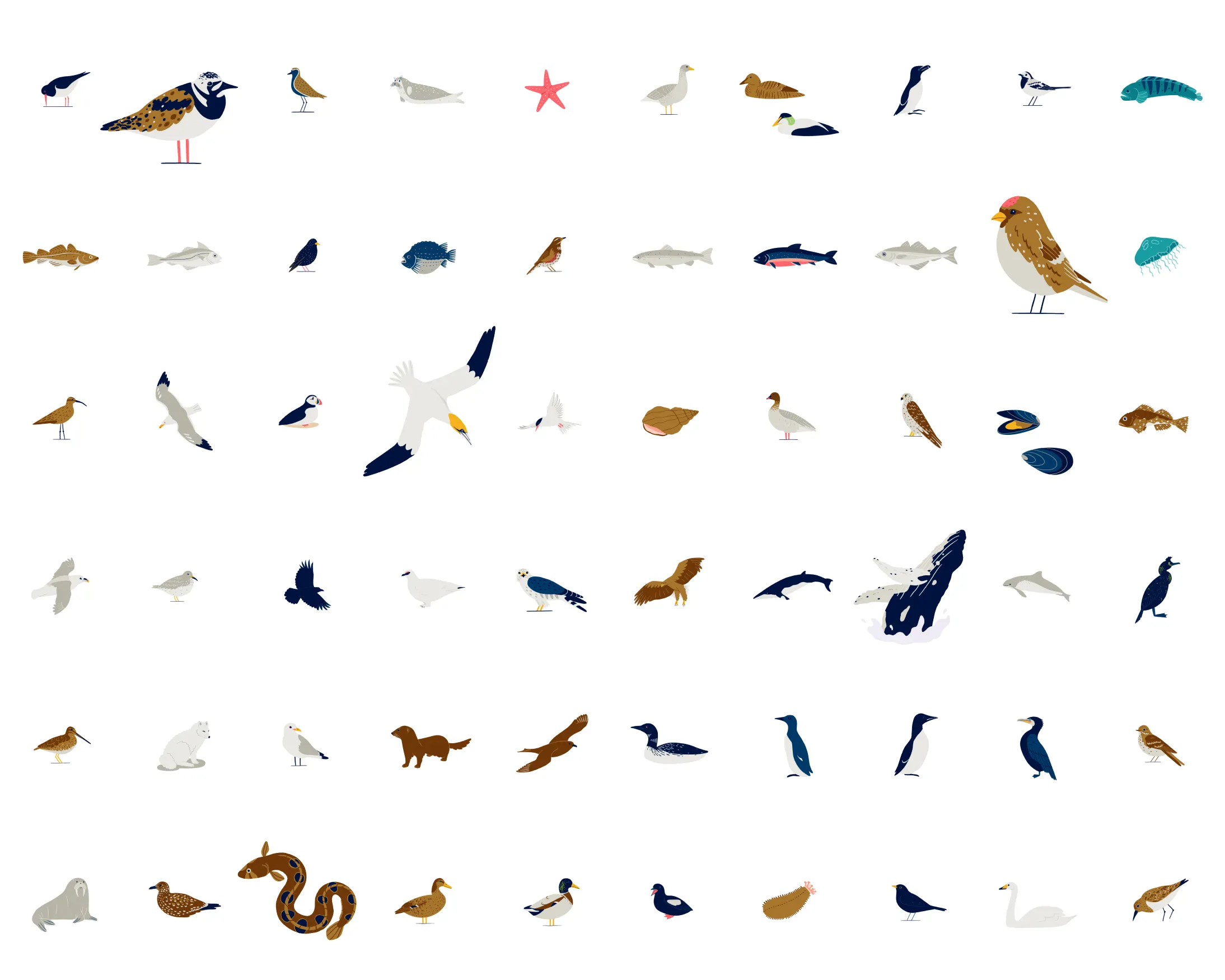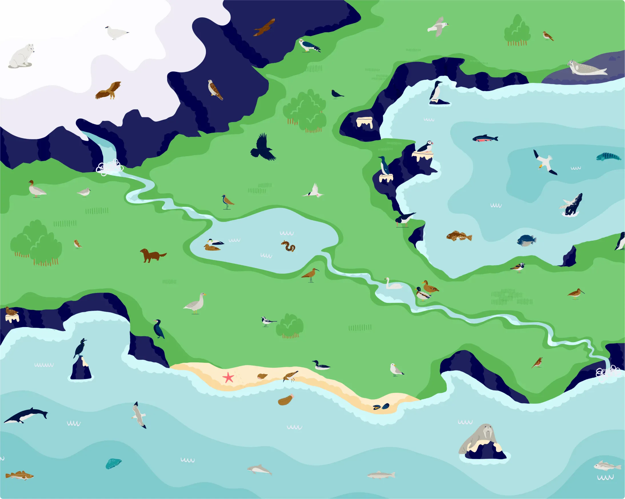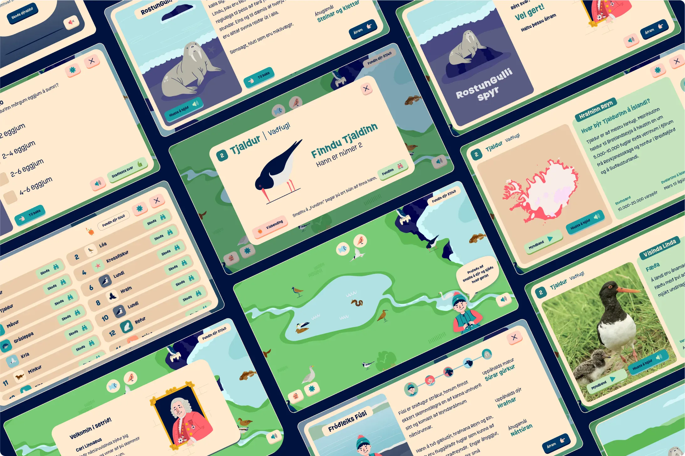 To make the game accessible for young users, it was centered around an interactive map inspired by the Science and Learning Center’s layout. This map features colorful illustrated animals that children can compare to real exhibits, guided by Fúsi and friends. The design focused on clarity and visual appeal for tablet screens. With the vibrant world in place, the next phase involved creating 61 animal illustrations and refining the overall gameplay to highlight Iceland’s diverse wildlife.