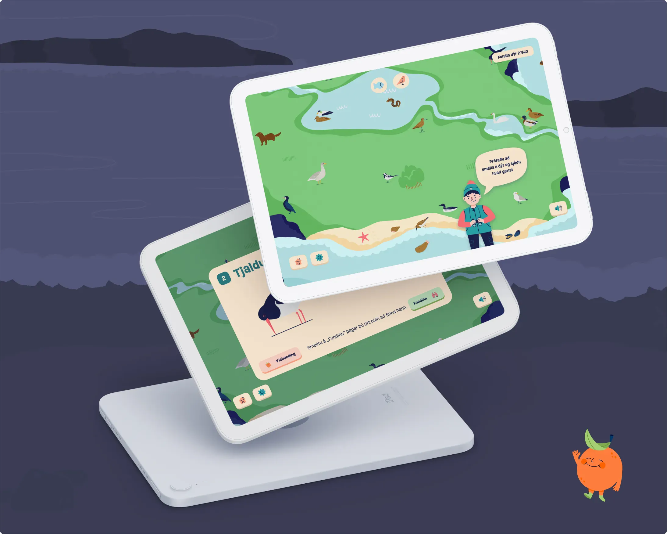 At the start of the project, the game concept was still developing. Initial character ideas and a rough educational outline were provided by the client. In collaboration with the Suðurnes Science and Learning Center, a colorful and engaging world was created—defining environments, characters, and gameplay. The cast includes Fróðleiks-Fúsi, Vísinda-Linda, RostunGulli, clever ravens Reyn and Rýn, biologist Carl von Linné, and Lína Appelsína, who guide players and share fun animal facts throughout the game.