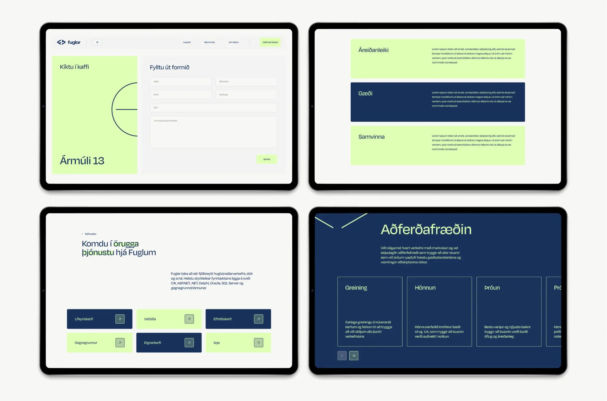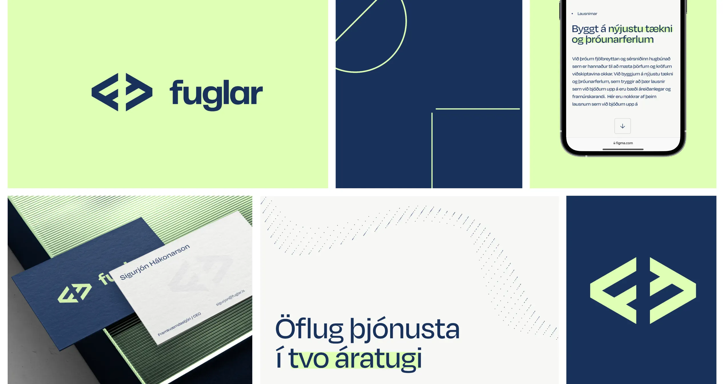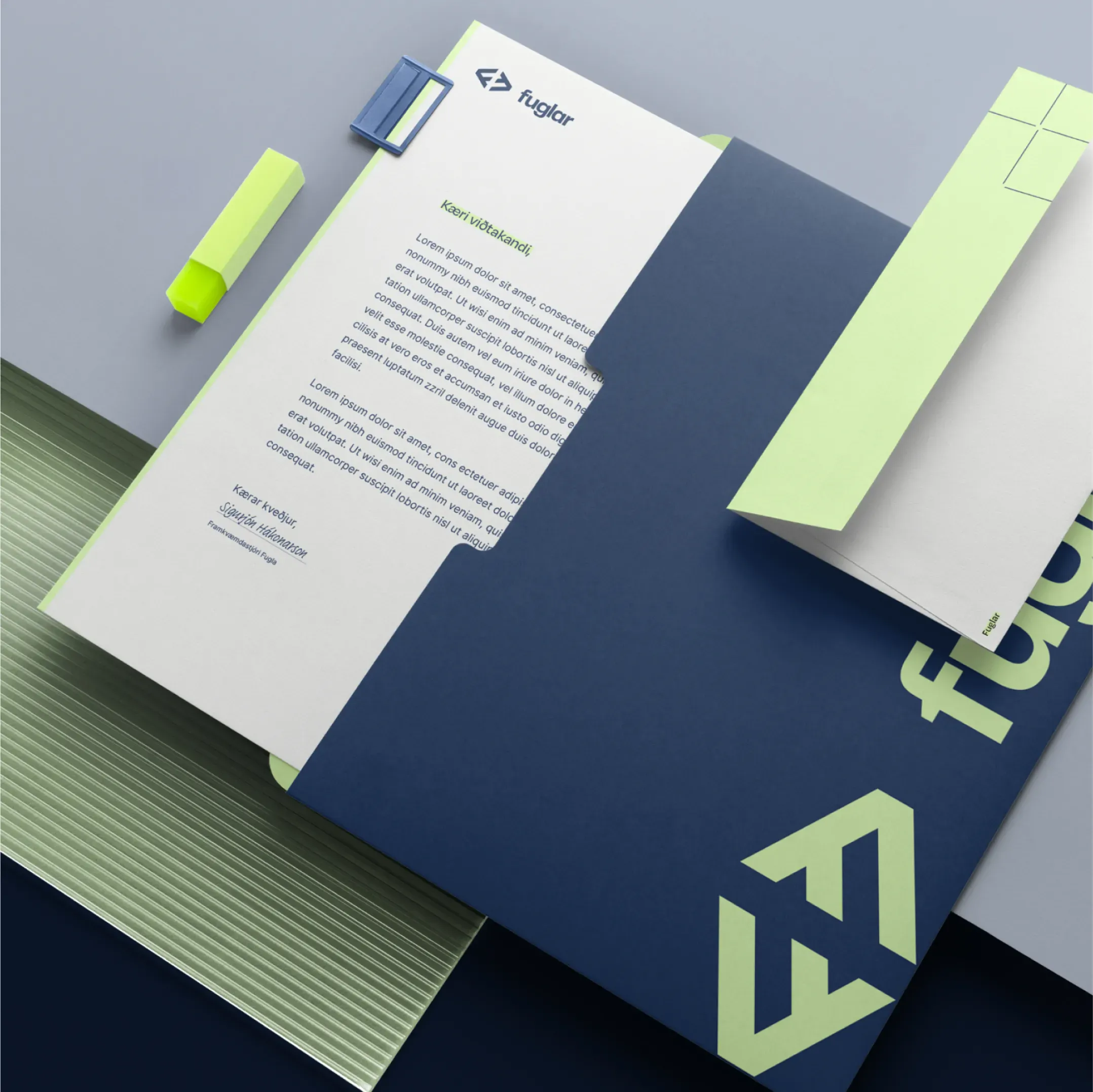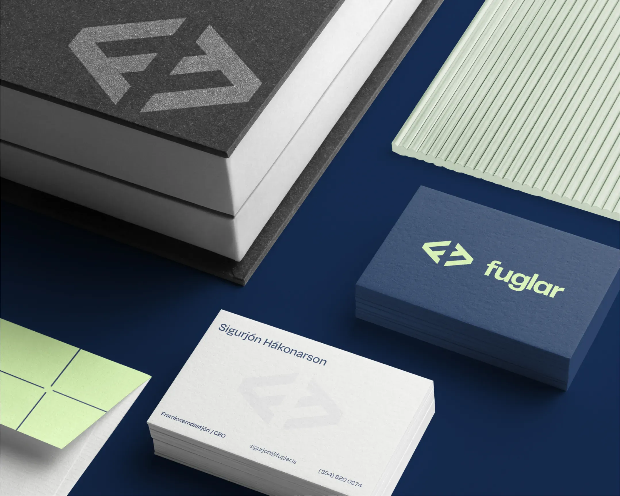 Fuglar’s rebrand centers on a deep navy and crisp white palette for trust and stability, paired with a lime green accent for energy and innovation. Together, they strike a perfect balance between professionalism and creativity.