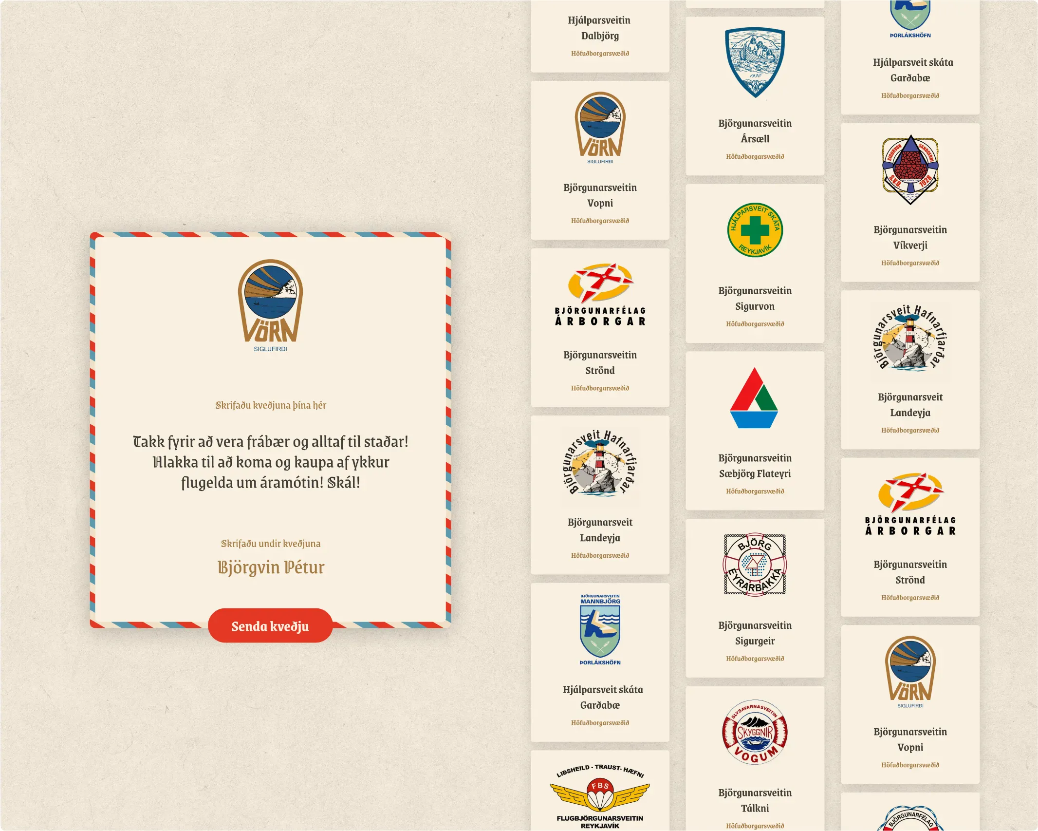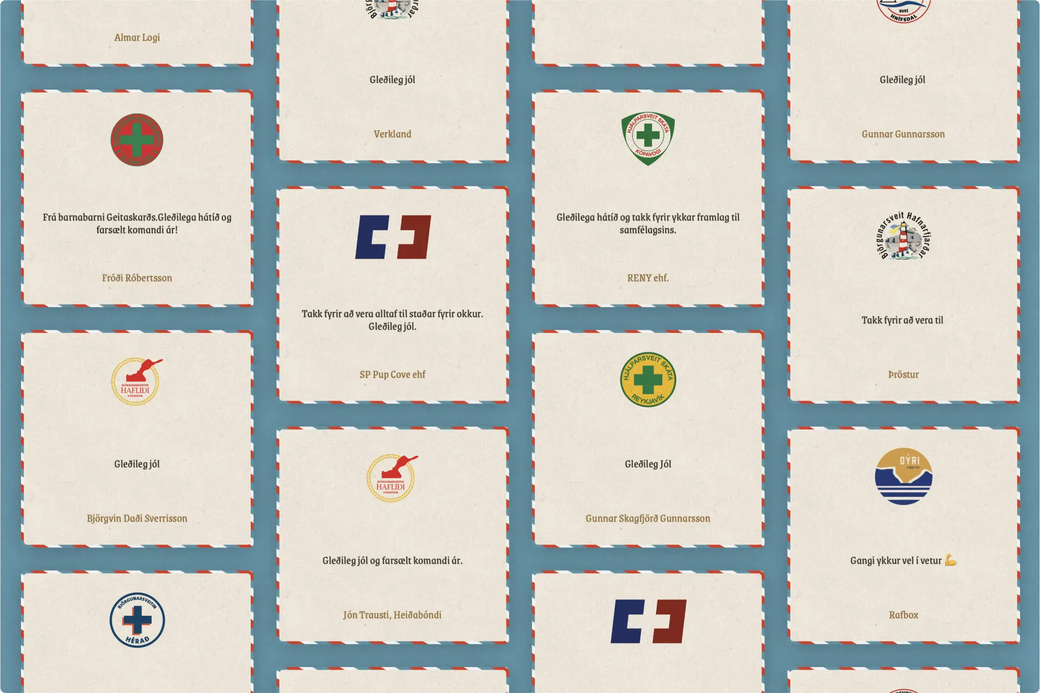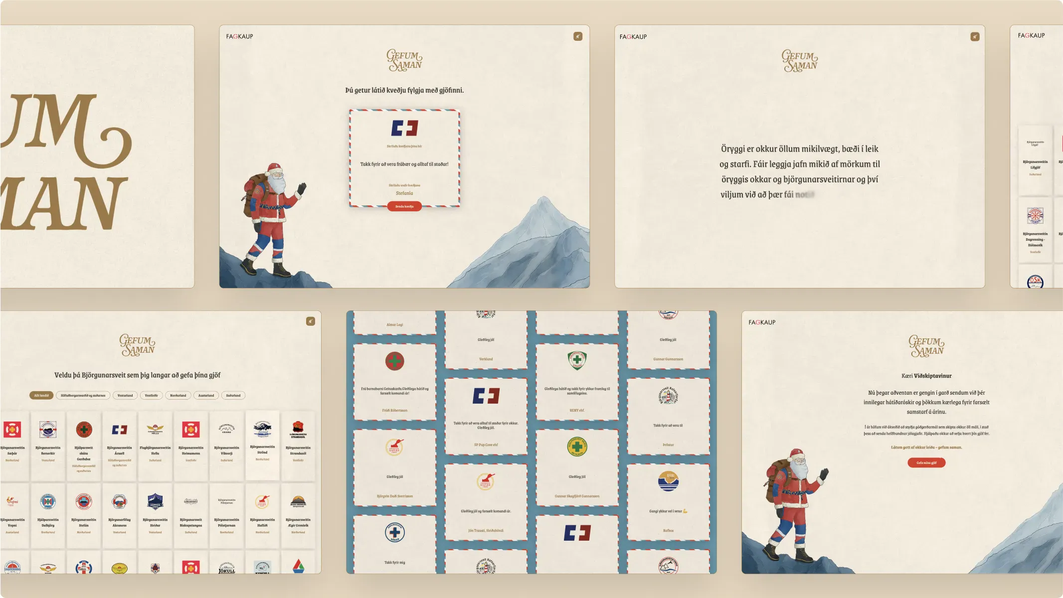 In December 2024, Fagkaup launched the Christmas initiativeGefum saman, shifting away from traditional corporate gifts to support Iceland’s search and rescue teams (ICE-SAR). Employees could direct their donation to a rescue team of their choice along with a holiday greeting. To manage the project, we created a cozy, Christmas-themed website inspired by vintage holiday cards, featuring warm colors, Christmassy fonts, and beautiful textures to evoke a heartfelt and nostalgic festive spirit.