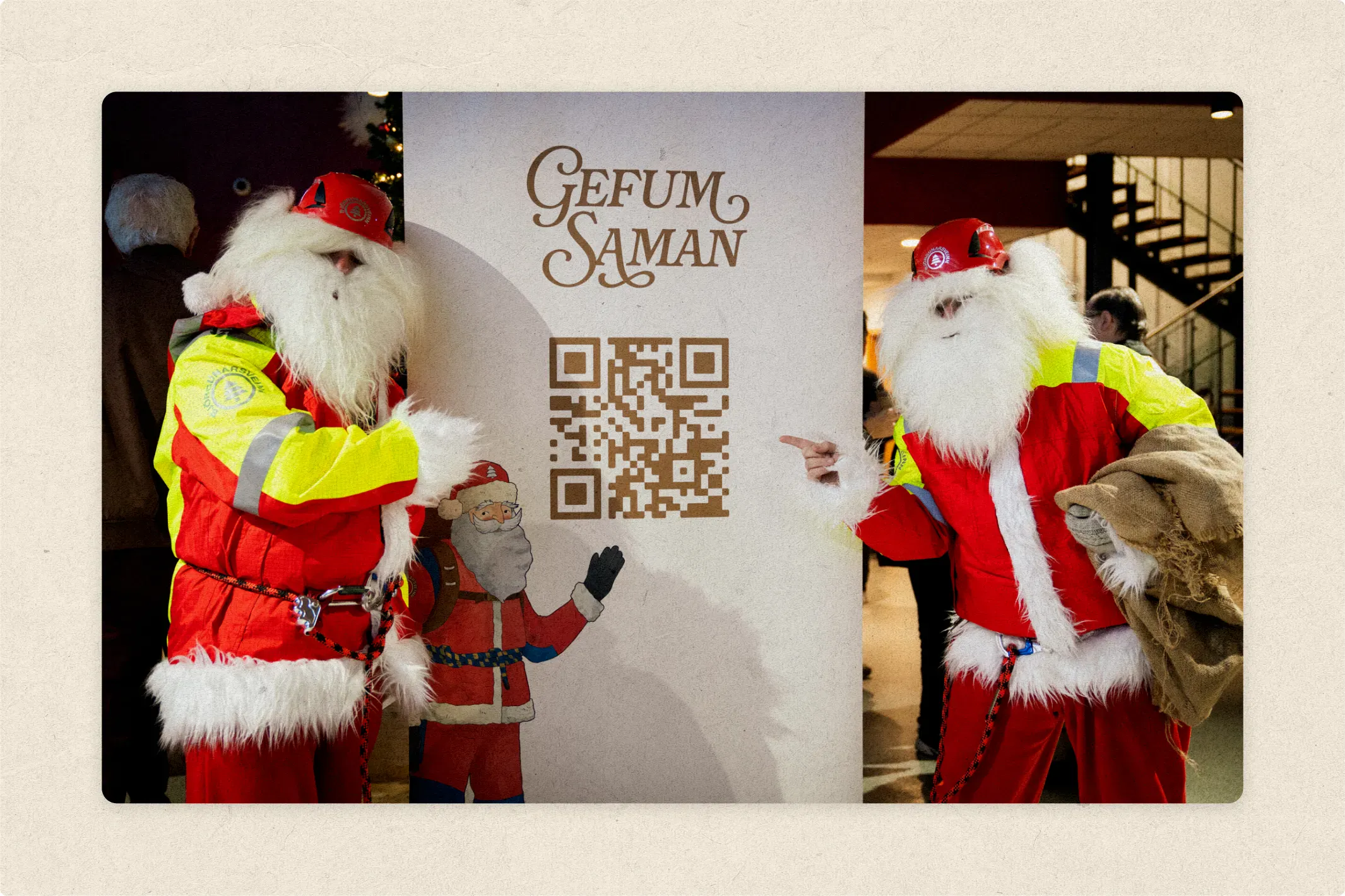 Björgunarsveinninn was created as a unique costume for Fagkaup’s annual Christmas party, where Santa made an appearance to entertain guests. The design aimed to blend the classic look of Santa Claus with recognizable elements from ICE-SAR uniforms. The red costume features a red hat with a reflective patch, reinforced elbows and knees, hiking boots, and a backpack. Instead of a belt, a climbing rope is tied around the waist. Developed in collaboration with ICE-SAR, the design ensured the costume remained distinct from official rescue gear.